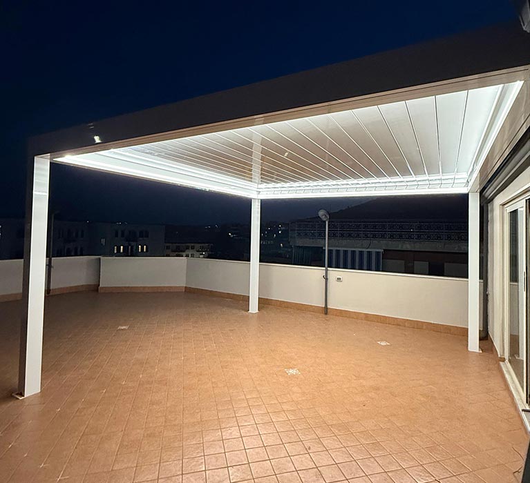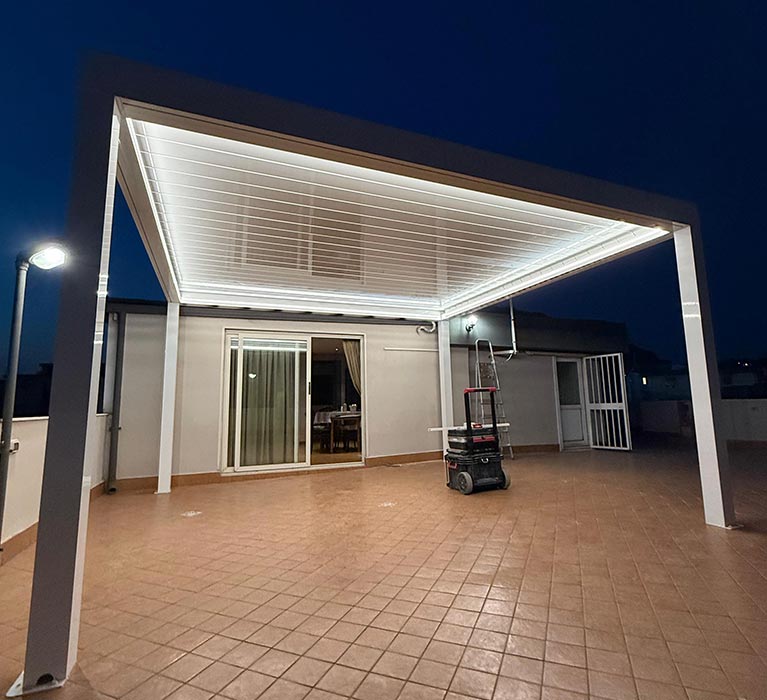 Utilizziamo alluminio di alta qualità, tessuti tecnici e componenti certificati per garantire prestazioni superiori e durata nel tempo. Ogni copertura è progettata per resistere a carichi neve e vento secondo le normative locali.